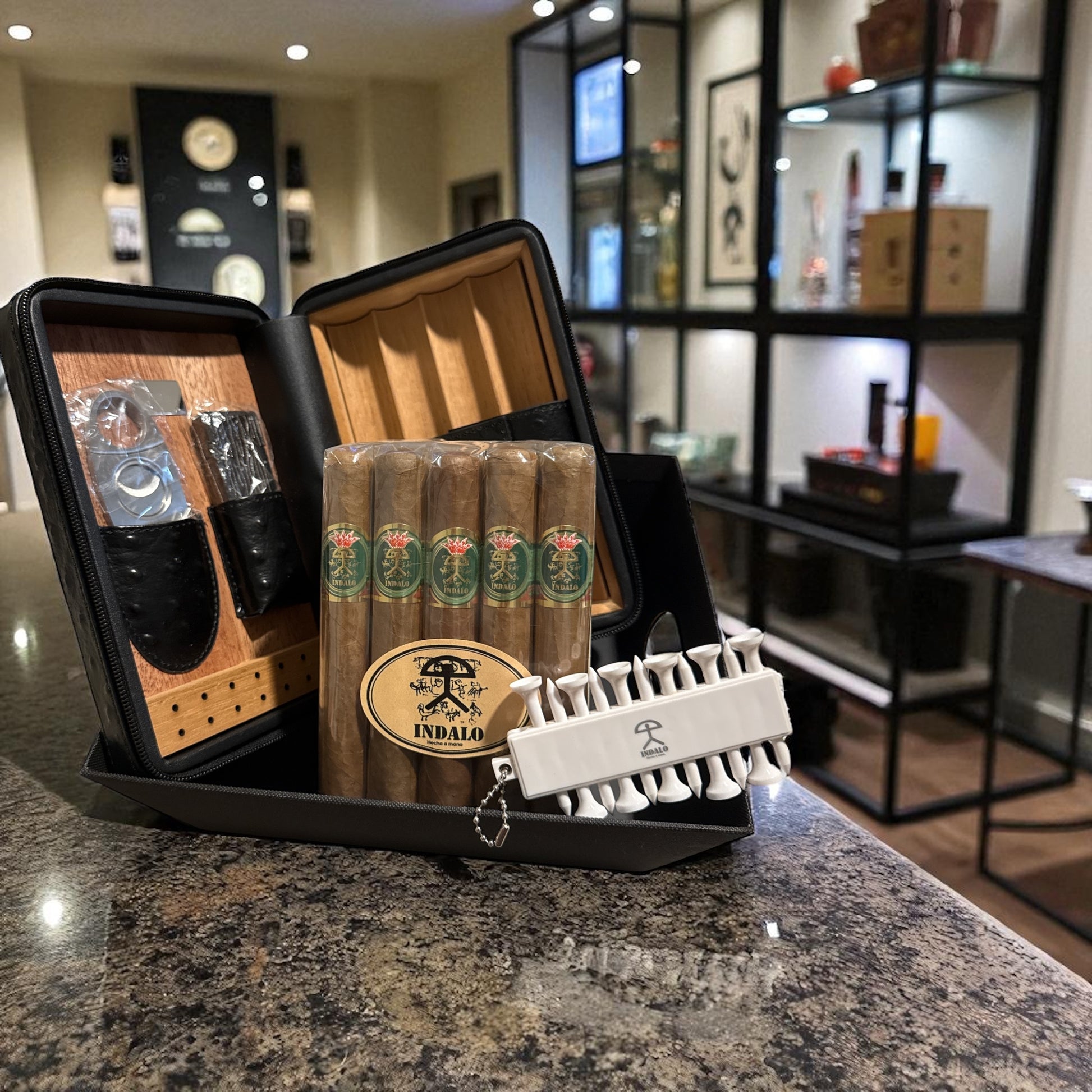This Indalo Gift Basket features a 20-count bundle of smooth Connecticut wrapper cigars, paired with a 4–8 count Manhattan Travel Cigar Case Humidor complete with built-in accessories and golf tees. A perfect combination of luxury and convenience for cigar lovers on the go.